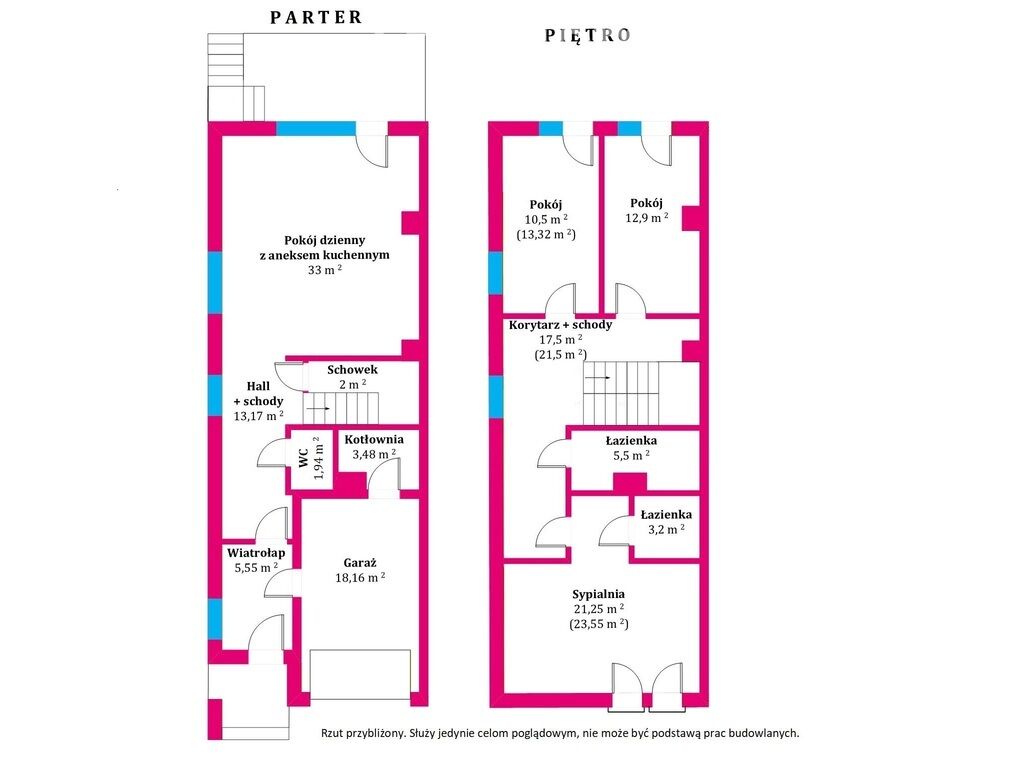 10,25 m², 12,9 m² i 21,25 m² oraz dwiema łazienkami (5,5 m² i 3,2