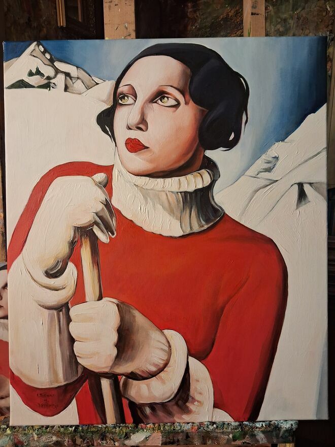 Kolekcjonerska interpretacja obrazu Tamary Łempickiej "Saint Moritz” – olej na płótnieOferuję ręcznie malowaną, kolekcjonerską interpretację jednego z najbardziej rozpoznawalnych motywów Tamary Łempickiej – ikony stylu art déco. Obraz łączy klasyczną elegancję, siłę kobiecego portretu i ponadczasowy styl, który doskonale odnajdzie się we wnętrzach nowoczesnych i klasycznych.