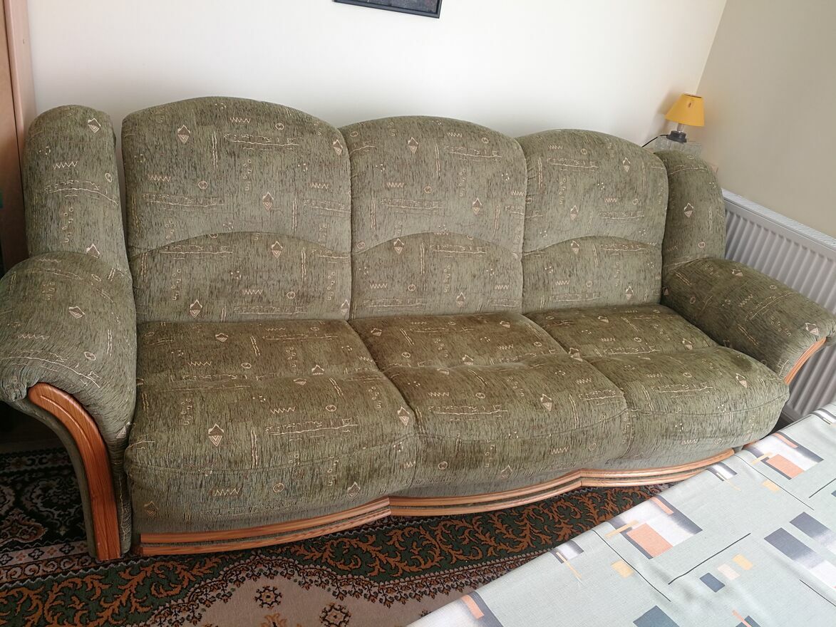 Sprzedam komplet wypoczynkowy w bardzo dobrym stanie,kolor odcień zieleni w drobny wzorekKrystyna