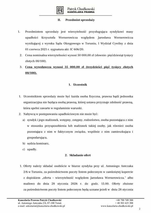 Syndyka masy upadłości sprzeda wierzytelności względem Jarosława Wernerowicza wynikającej z wyroku Sądu Okręgowego w Toruniu, I Wydział Cywilny z dnia 01 czerwca 2021 r. sygnatura akt: IC 606/20, o wartości nominalnej 50 000,00 zł (słownie: pięćdziesiąt tysięcy złotych 00/100) z wolnej ręki za cenę nie niższą niż 70% ceny oszacowania tj. 35 000,00 złSzczegóły odnośnie wierzytelności można uzyskać telefonicznie (790 - pokaż numer telefonu - ) lub w kancelarii syndyka: Kancelaria Prawna Patryk Chodkowski, ul. Antoniego Antczaka 2/6, 87-100 Toruń.
