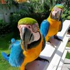 Samiec i samica ara niebiesko-złotej gotowe na nowy, stały dom. Są hodowane w domu, karmione ręcznie i potrafią ...